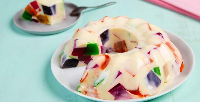 - Verter la mezcla de leche condensada: Corta las gelatinas de colores en cubos medianos y coloca en un molde mediano, intercalando los colores, vierte la preparación de la leche condensada encima, tratando de esparcir bien. Lleva al refrigerador hasta que cuaje (aproximadamente 3 horas).